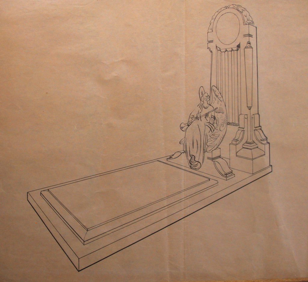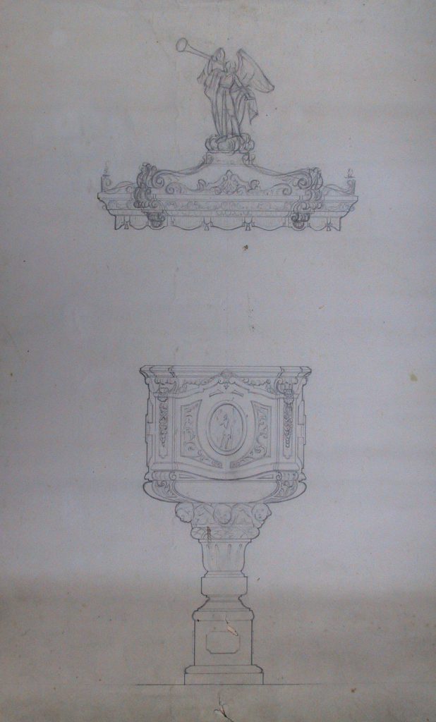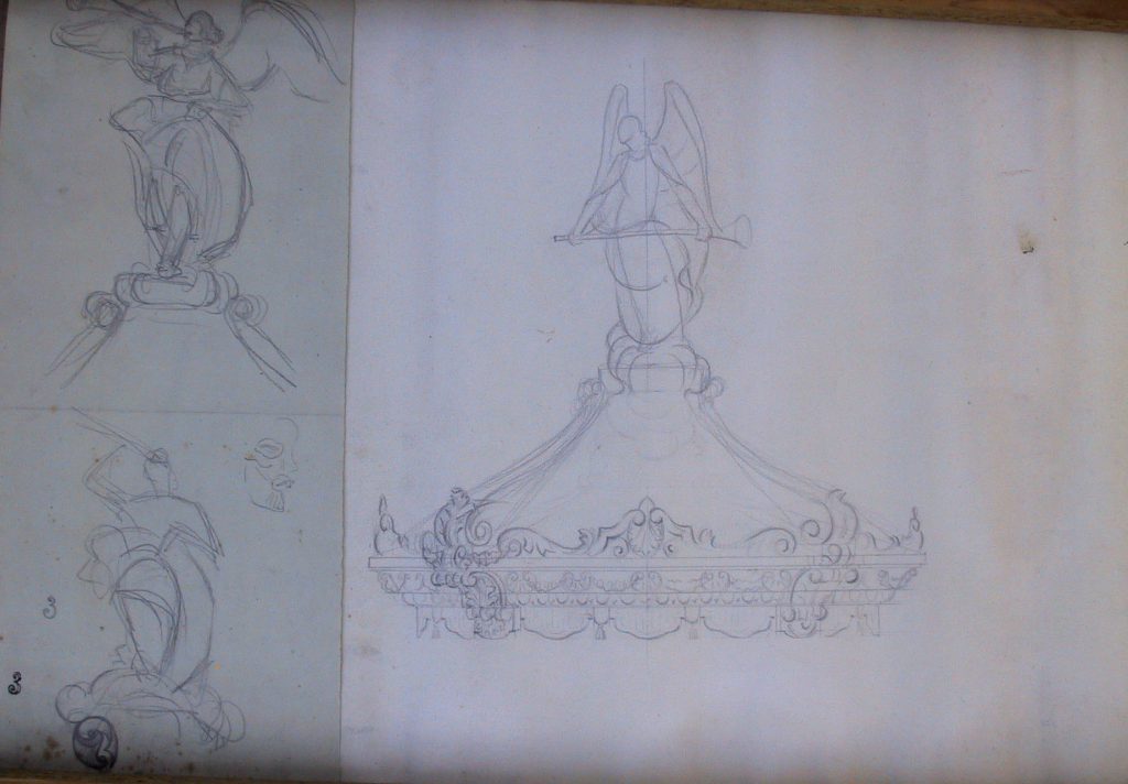 Obra : Boceto pulpito barroco con umbrela y remate de un angel tocando la trompeta.
