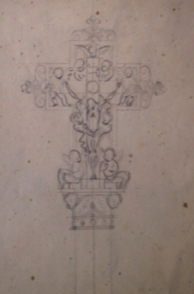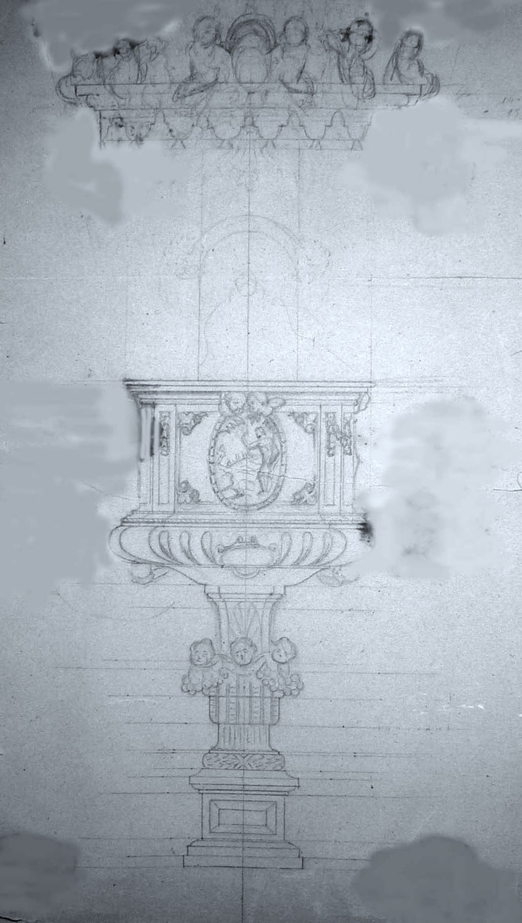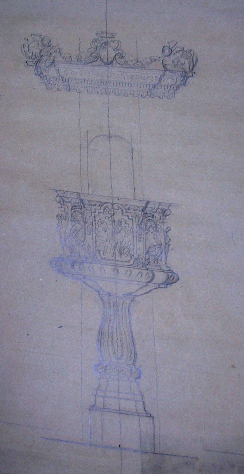 Obra : Boceto de pulpitocon querubines en el pié, con medallones en su cuerpo y angeles en la umbrela es el boceto que se ralizo para la iglesia de santos juanes.