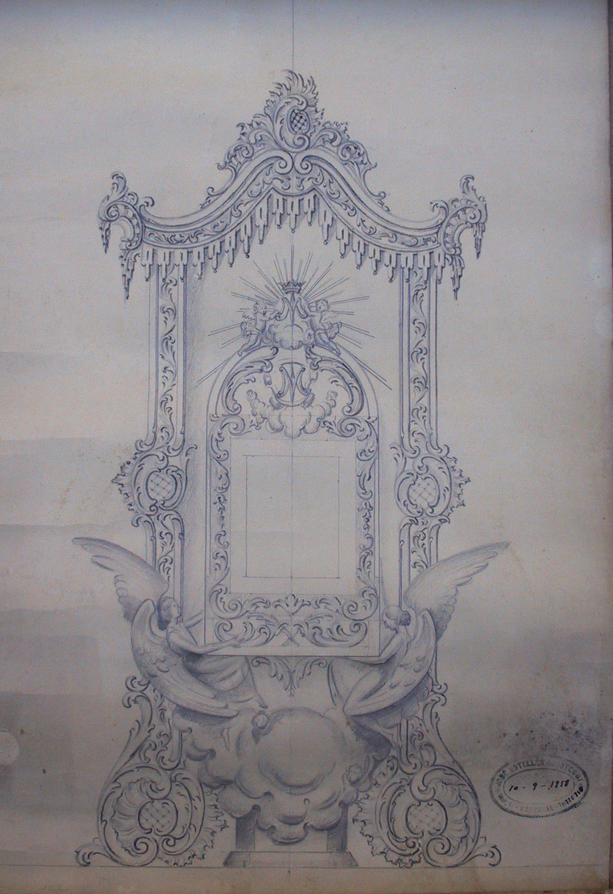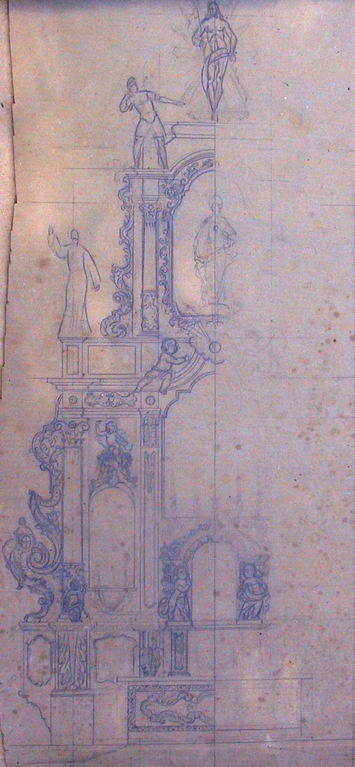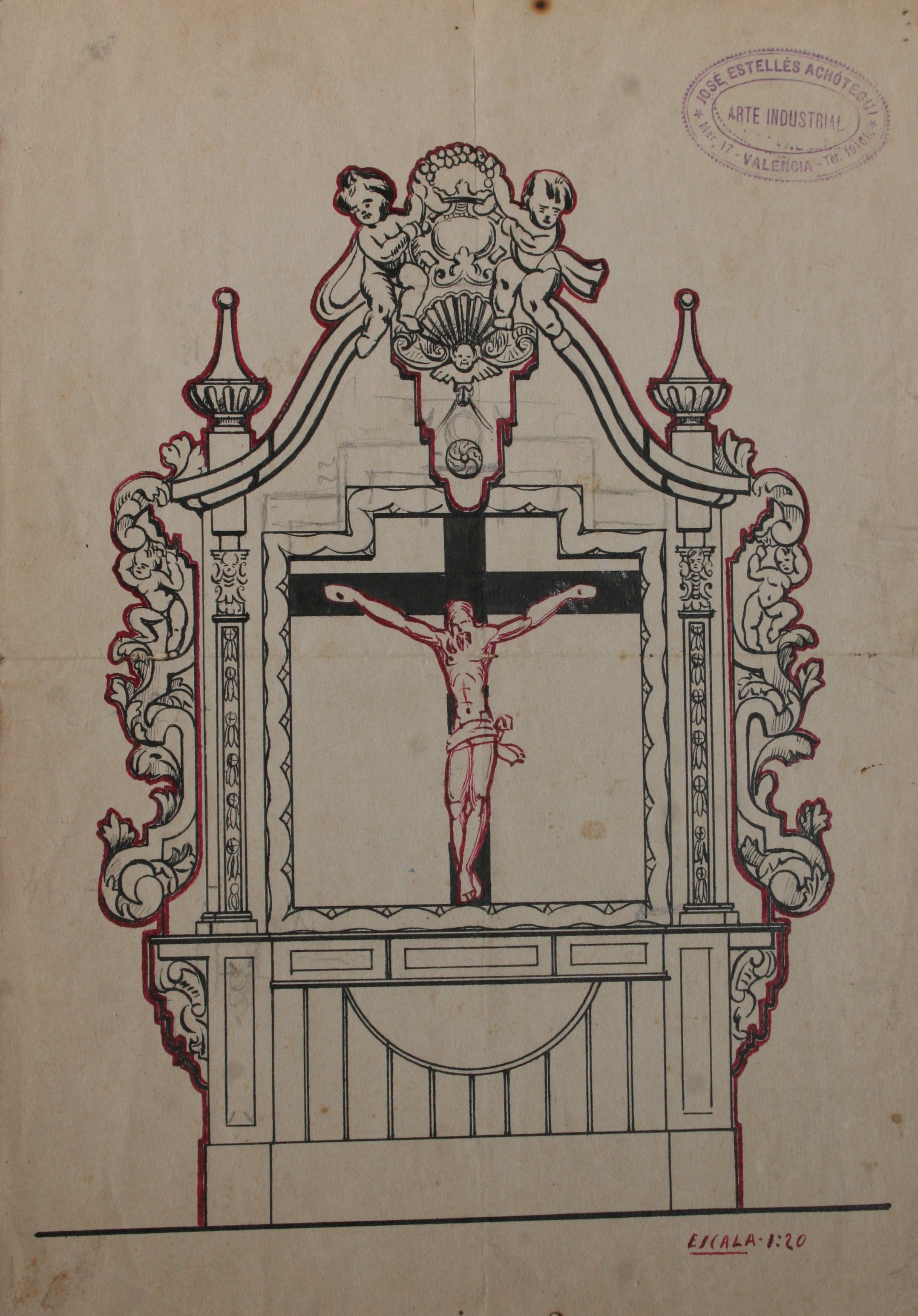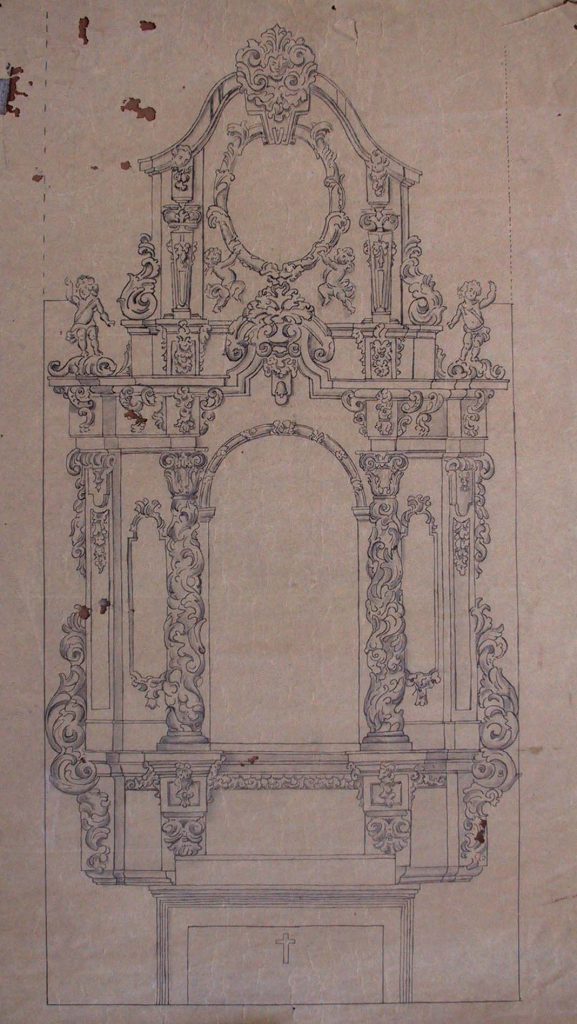 Obra : Dibujo de retablo con altar y figura central.
