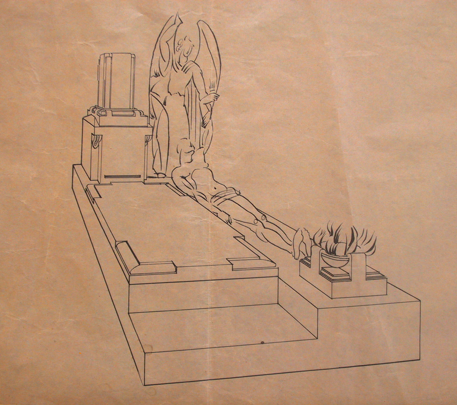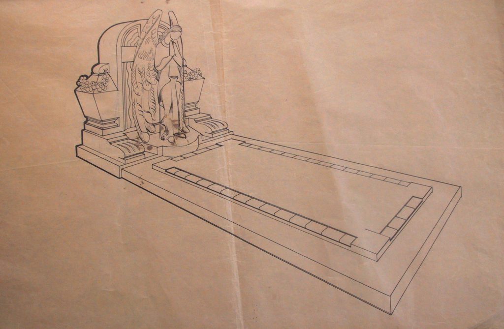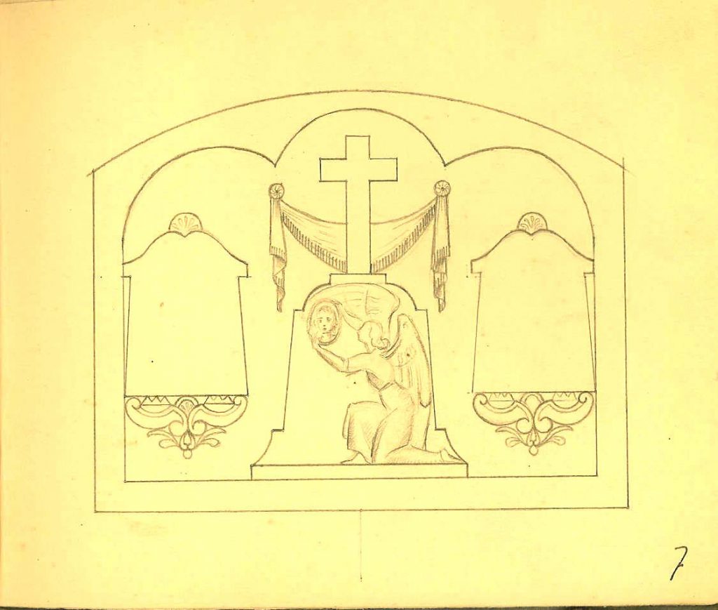 Obra8: : Boceto de lapida con una cruz central y dos Angeles alados en los laterales.