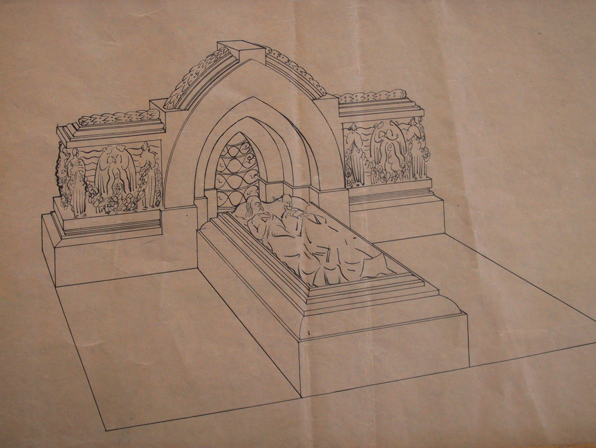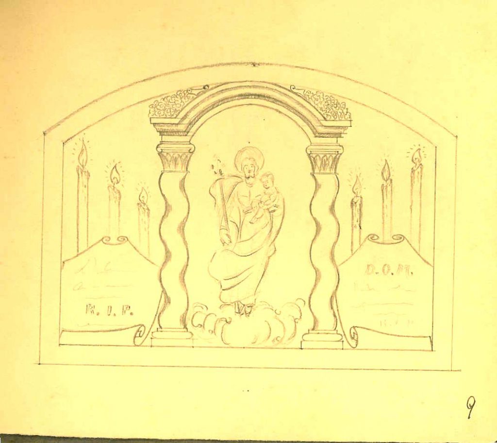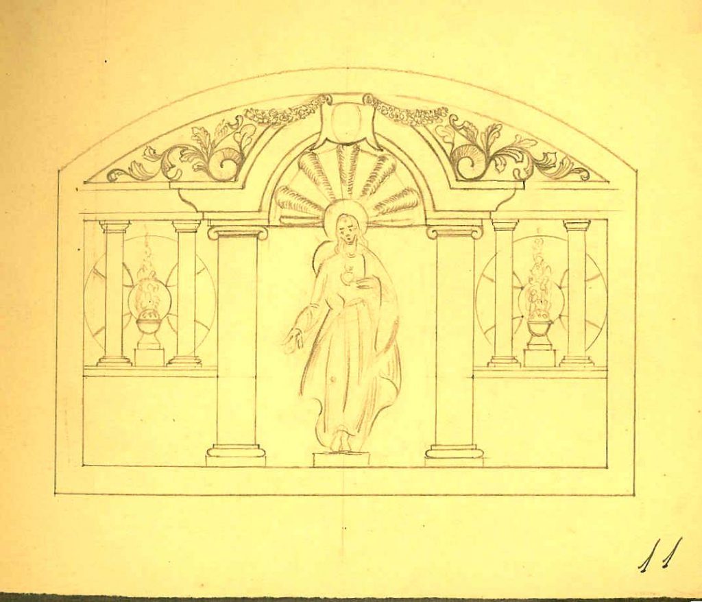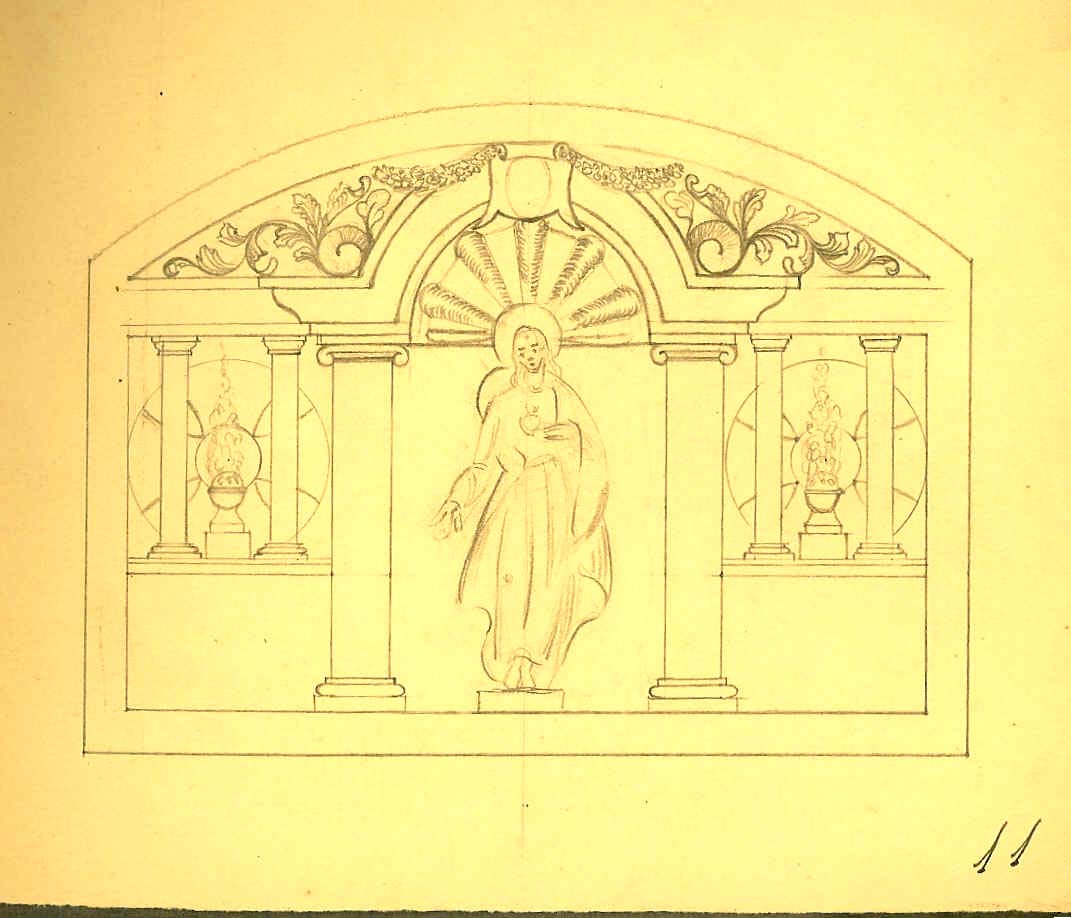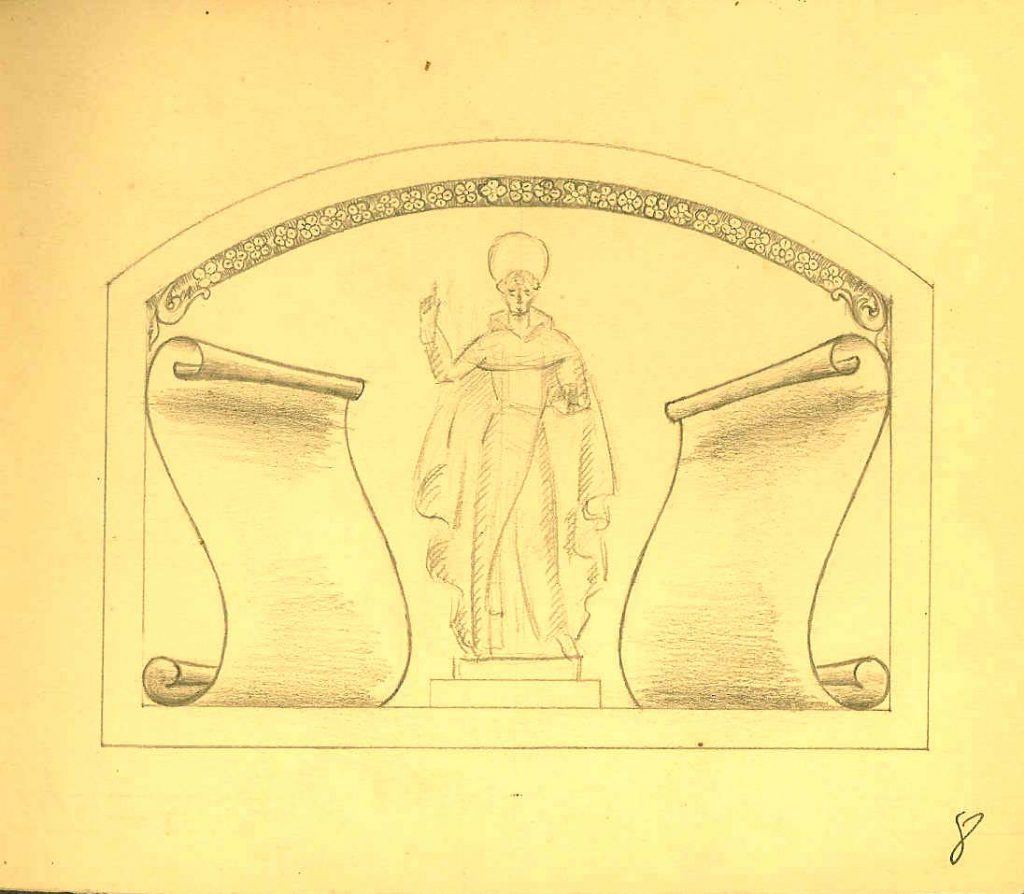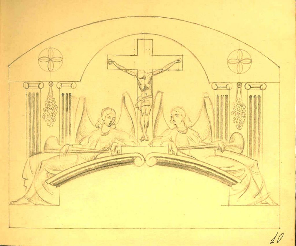 Obra8: : Boceto de lapida con un portico y la imagen de jesucristo central.