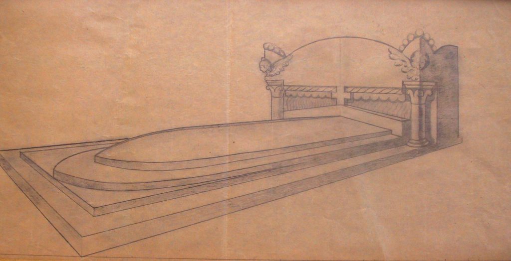 Obra : : Panteón subterráneo compuesto por una losa corrediza y un frontis con un gran ángel tañendo un instrumento en su centro, el fondo esta compuesto por un enorme elemento vertical figurativo de un arpa formada por columnas y un remate circular cerrado por arriba por una guirnalda.