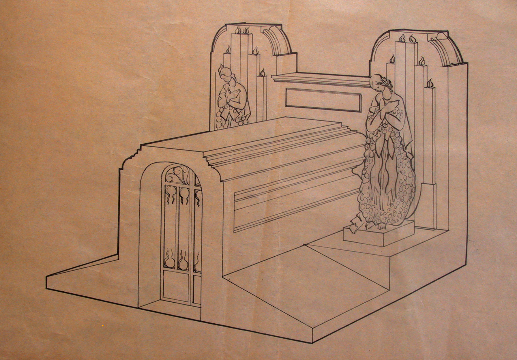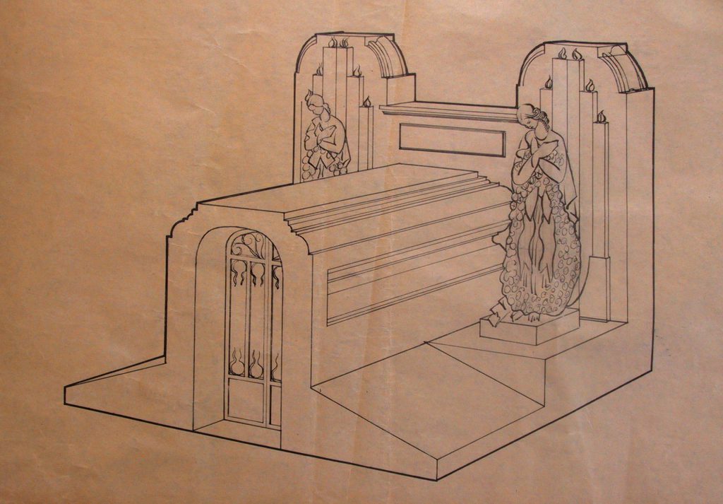 Obra : : Boceto de lapida con imagen central y dos antorchas en los laterales. .