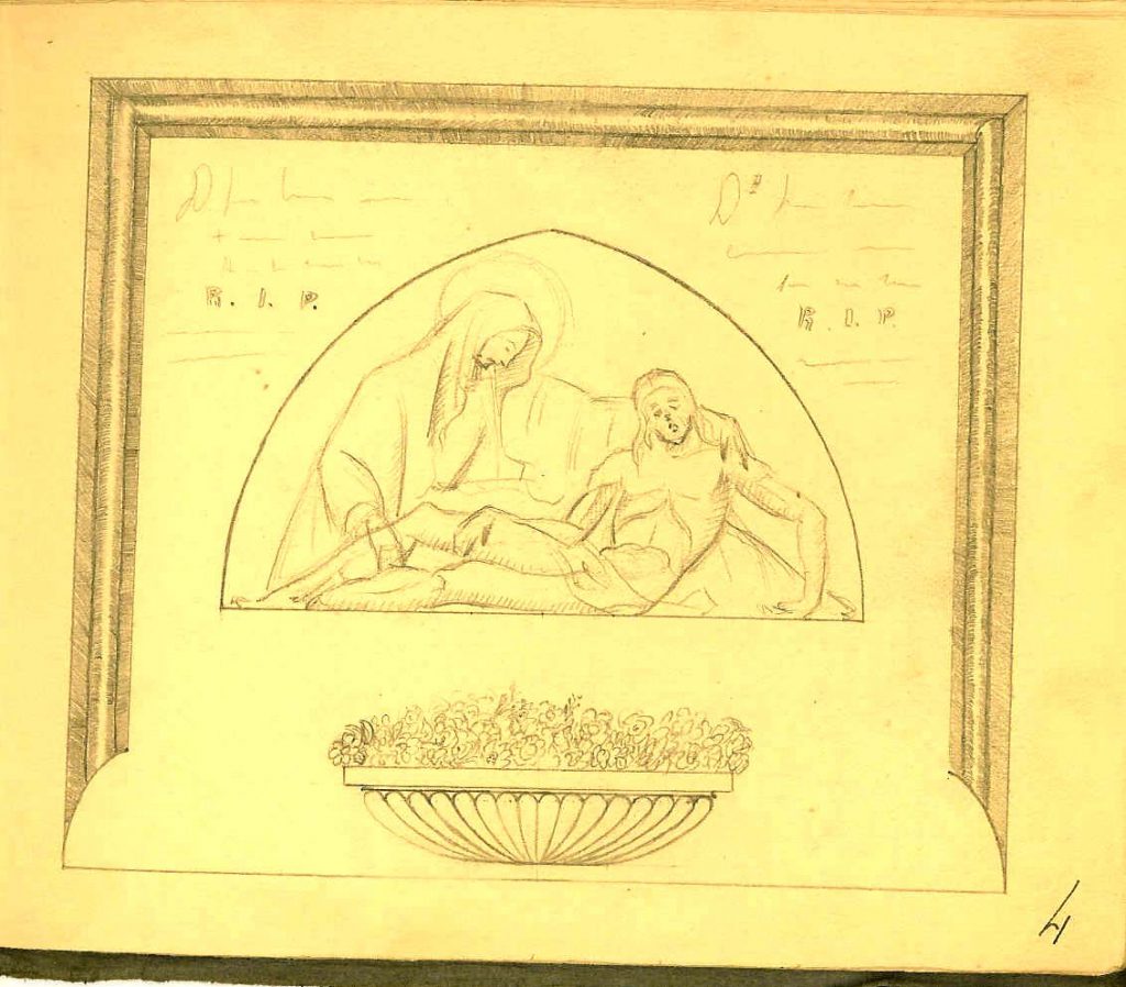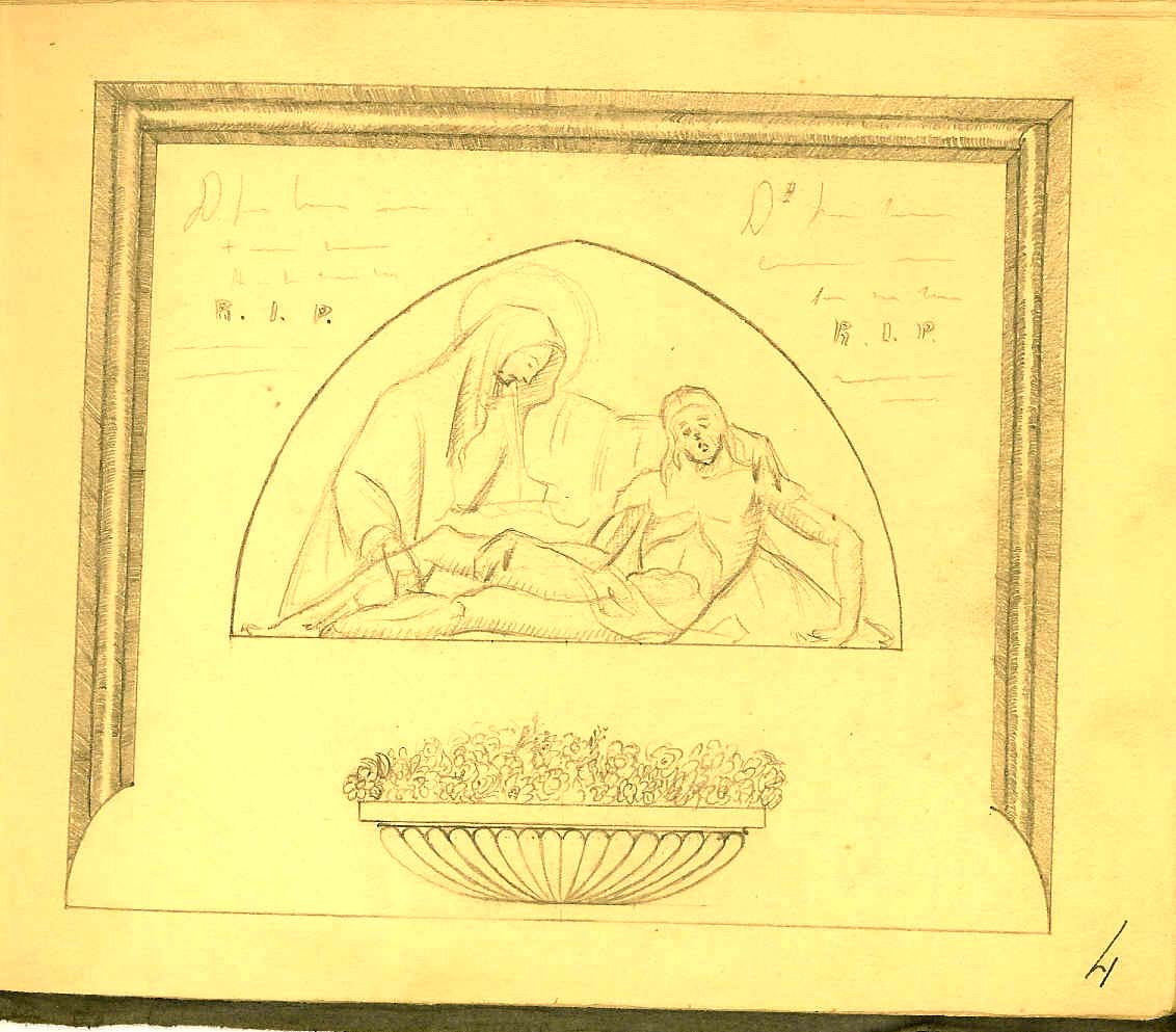 Obra : : Boceto de lapida con la pietat central y jardinera.