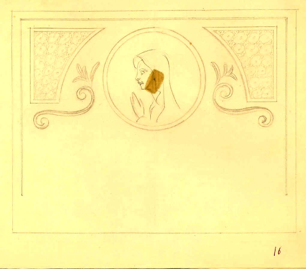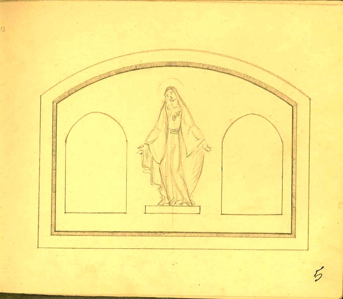 Obra8: : Boceto de lapida con una virgen central y un angel arrodillado.