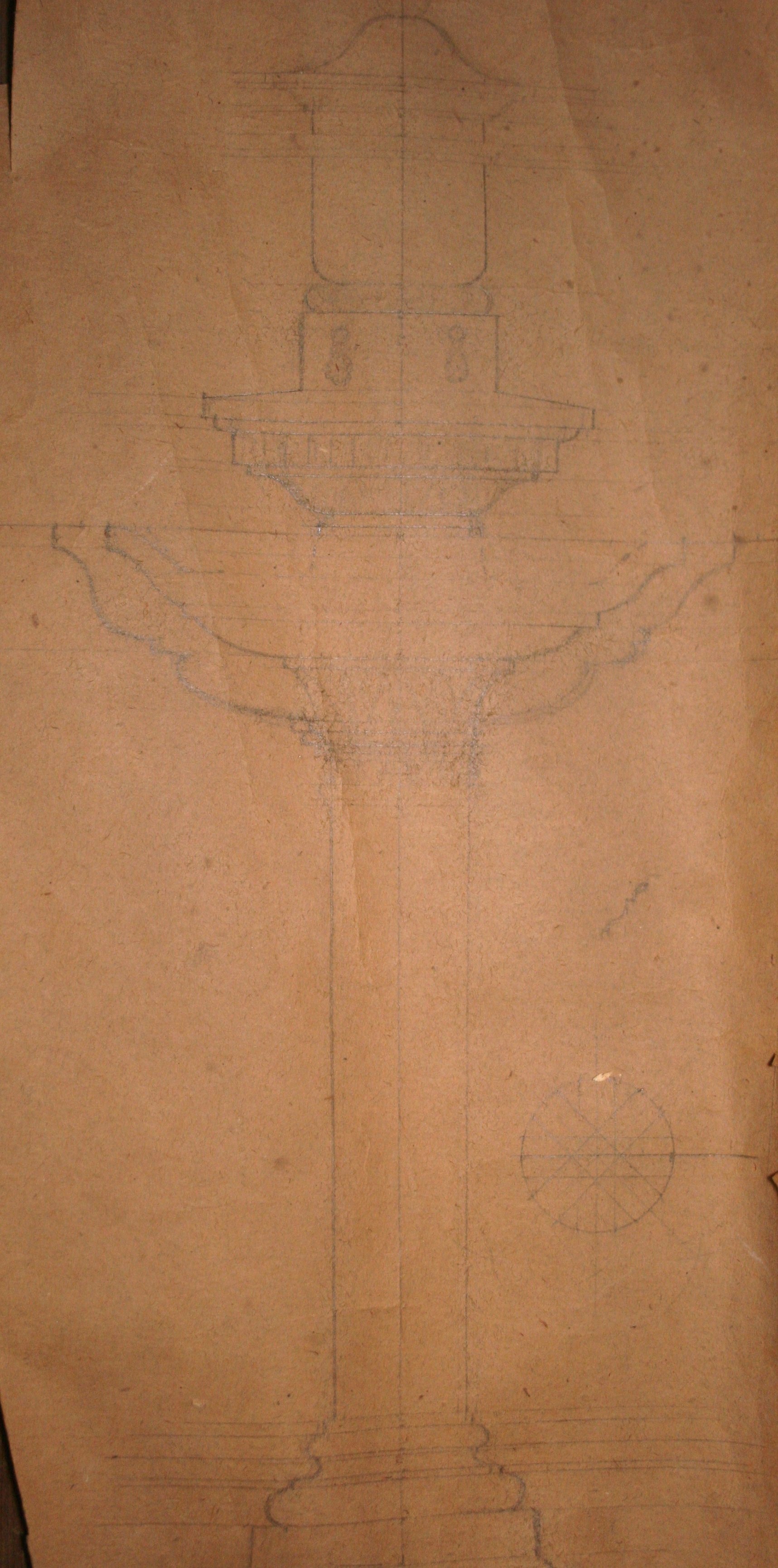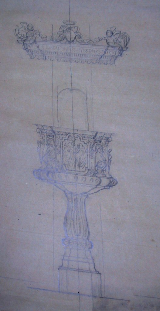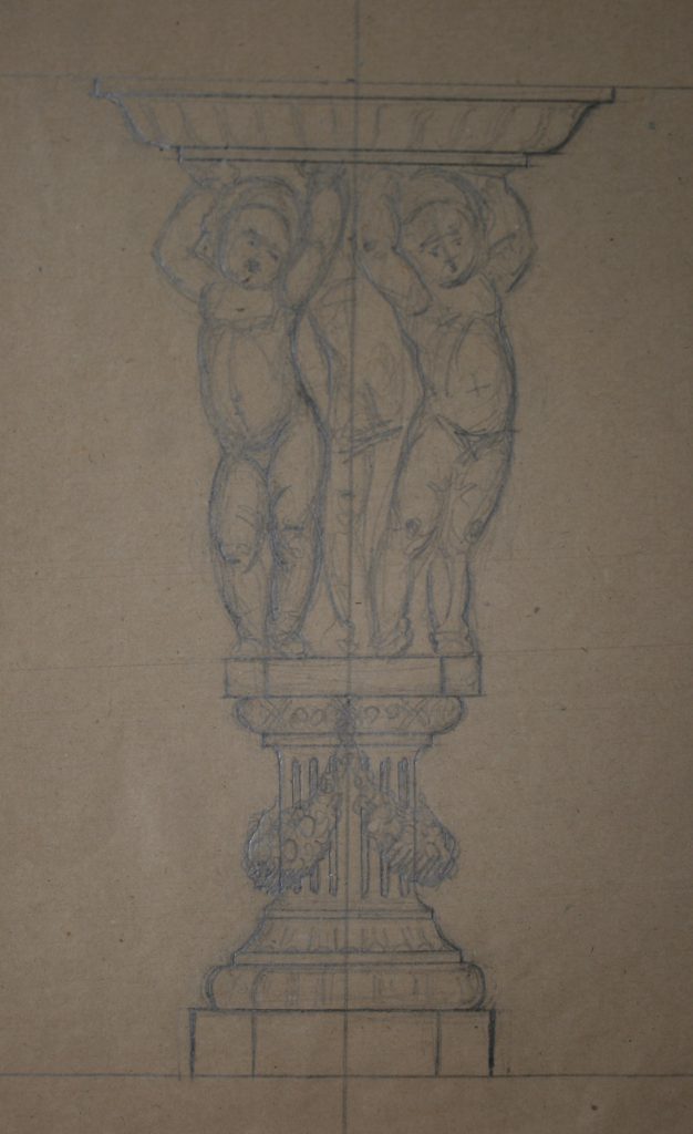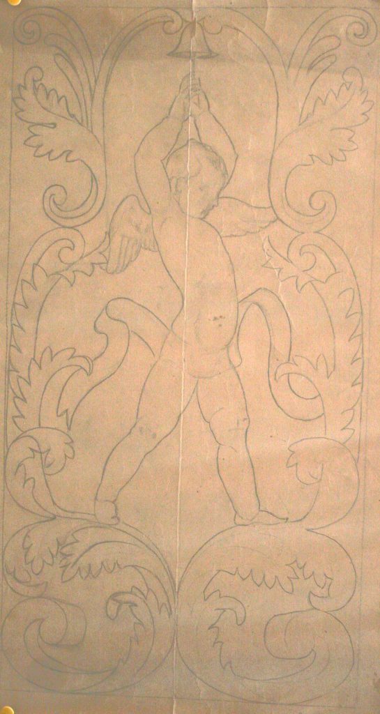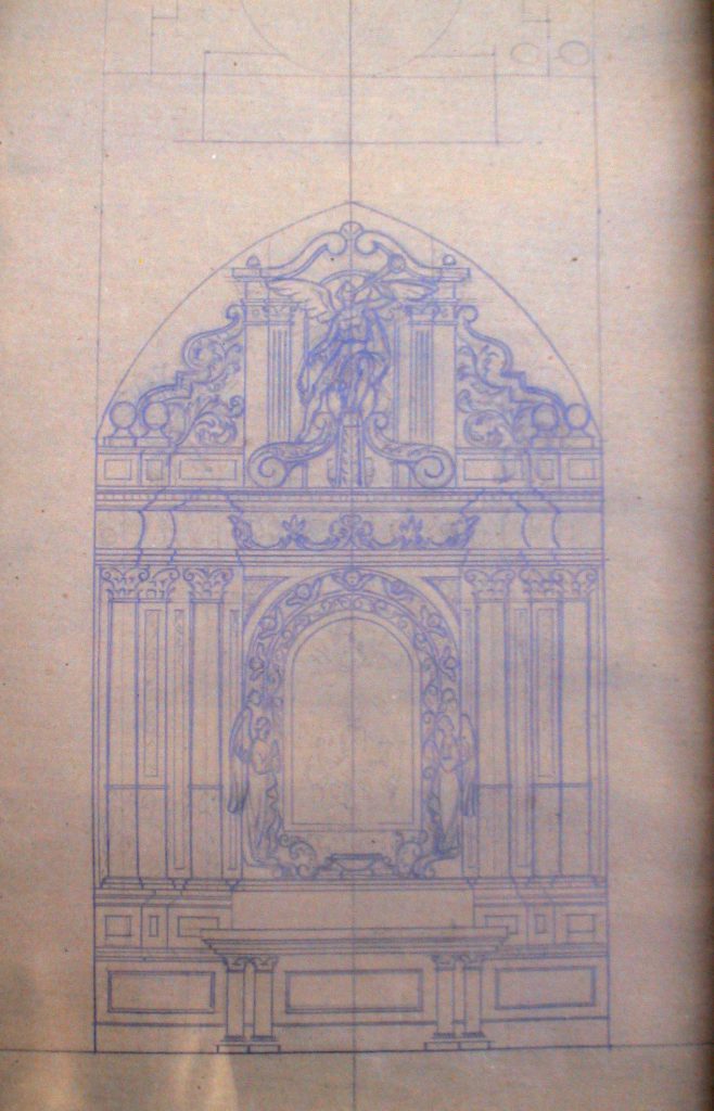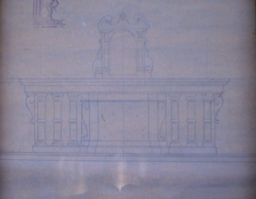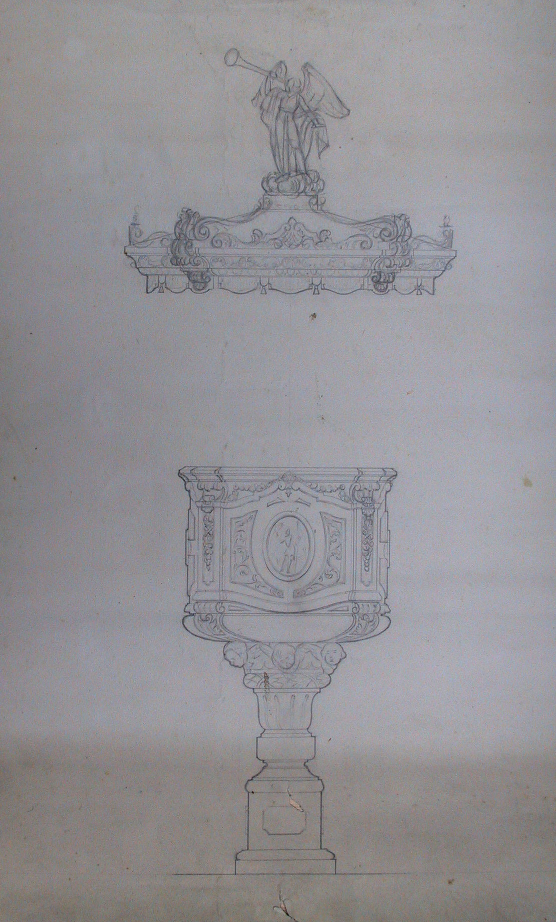 Obra : Boceto de pulpito con umbrela y remate de un Angel tocando la trompeta.