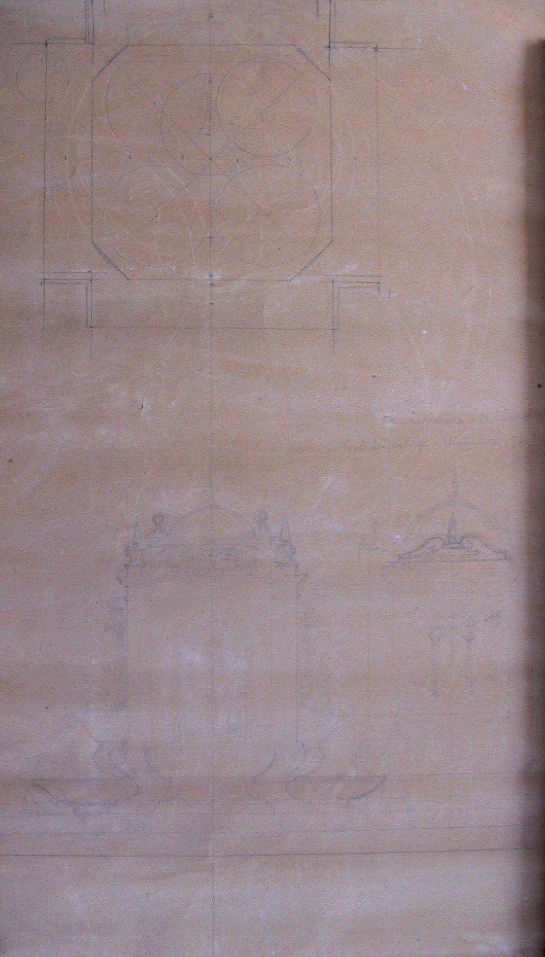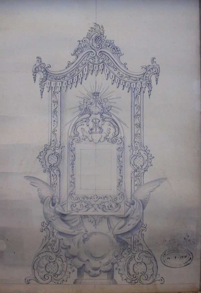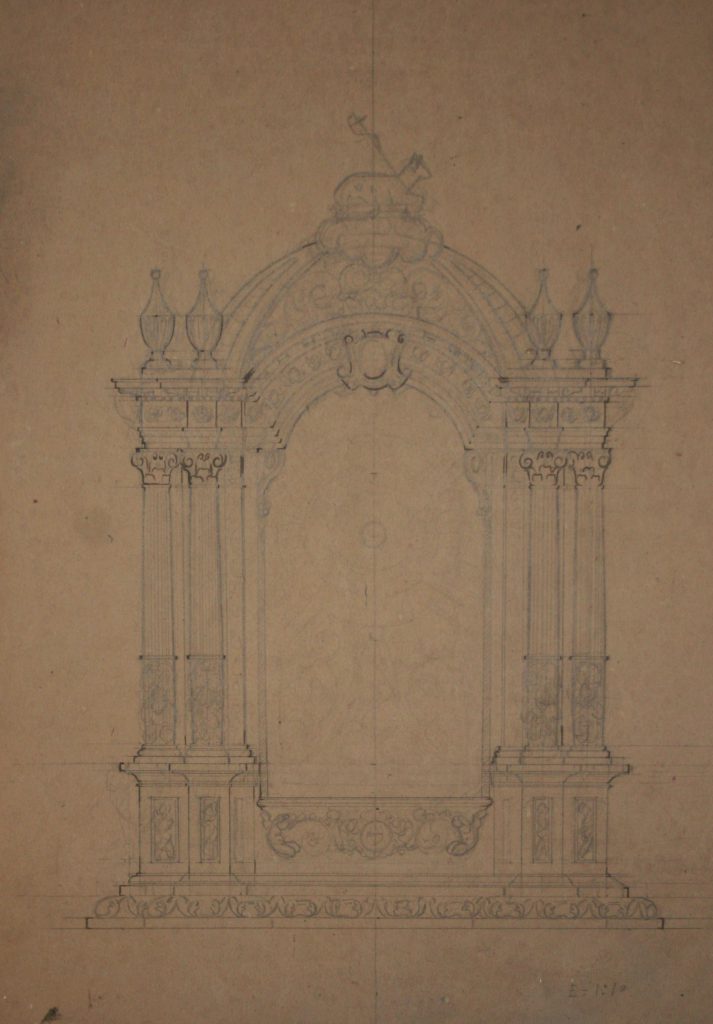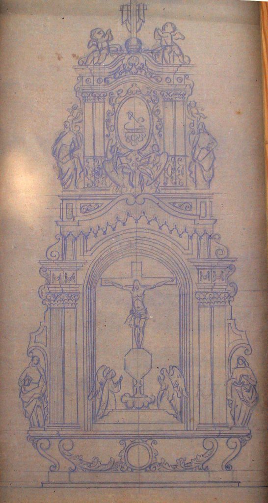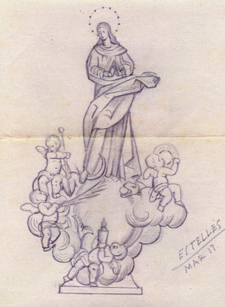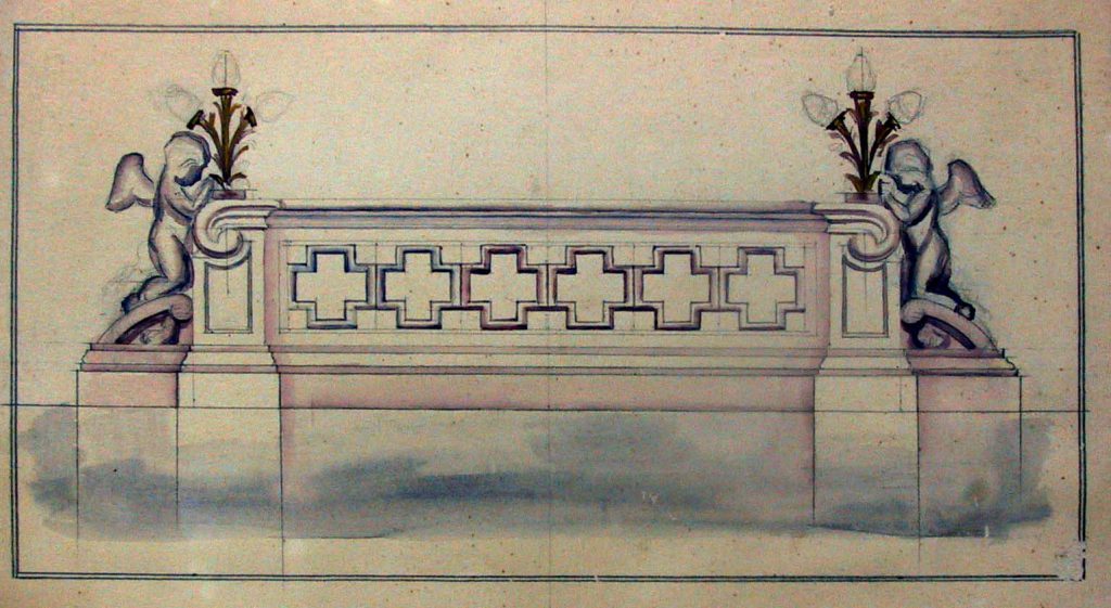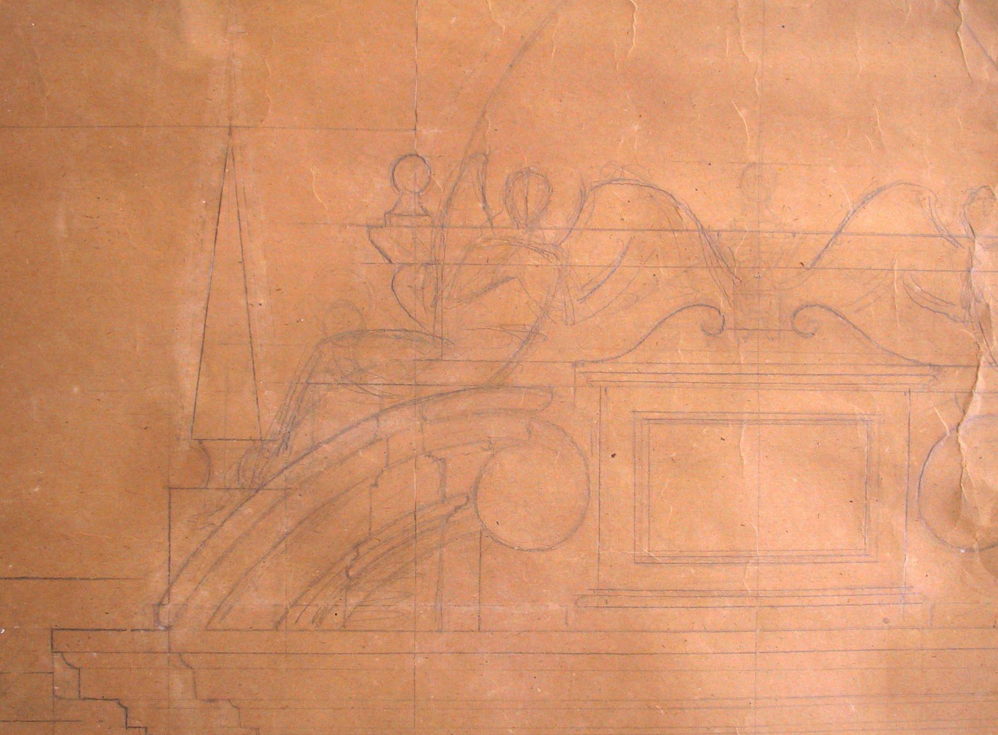 Obra : Boceto de pulpito con umbrela y remate de un Angel tocando la trompeta.