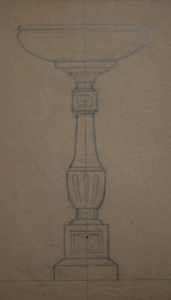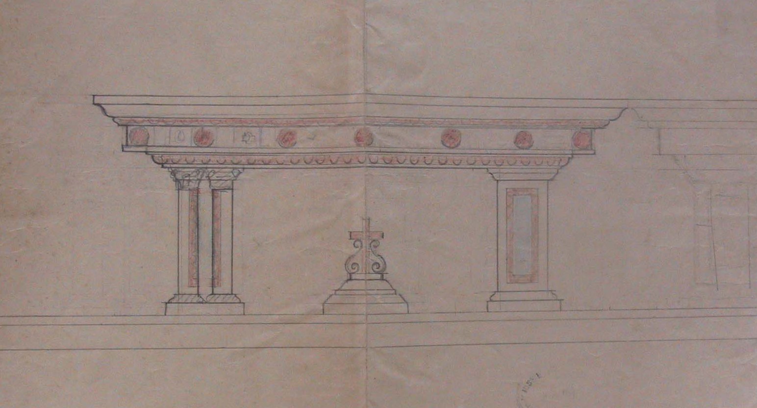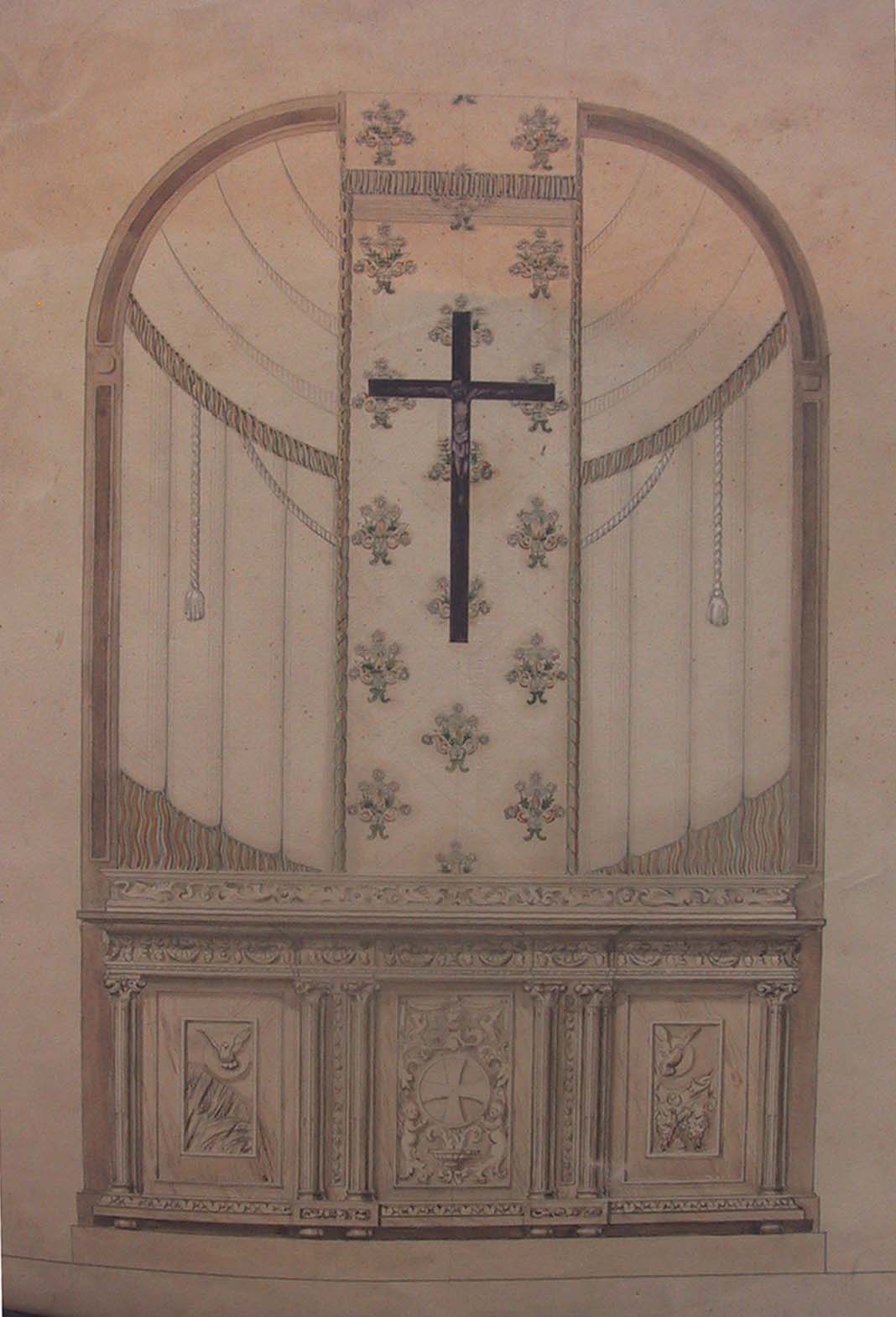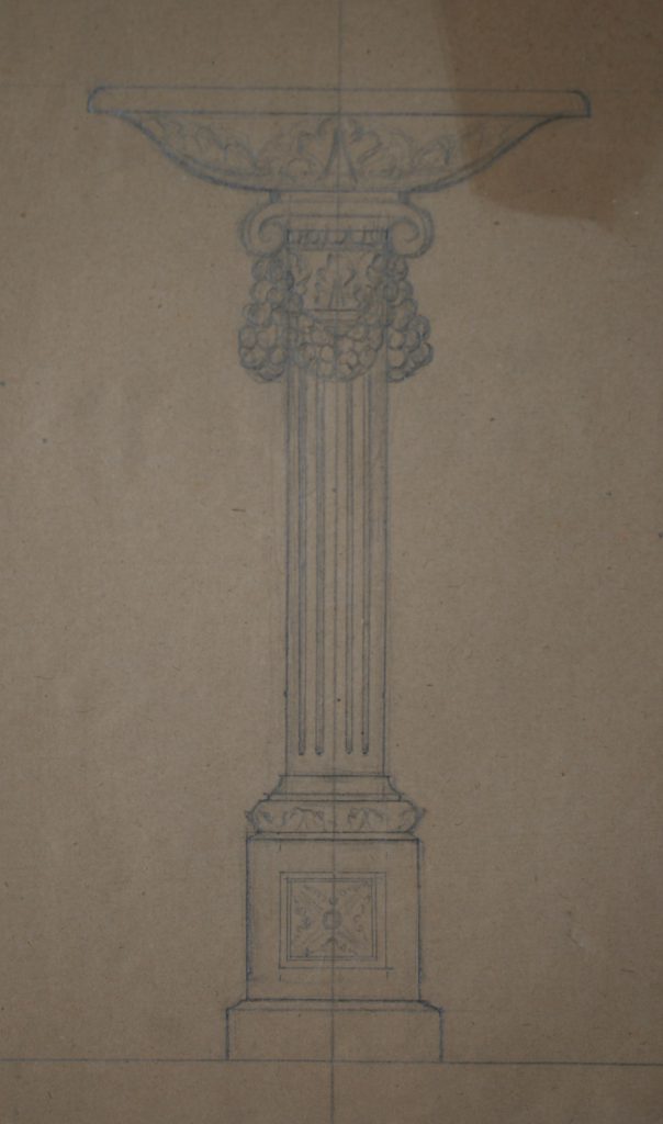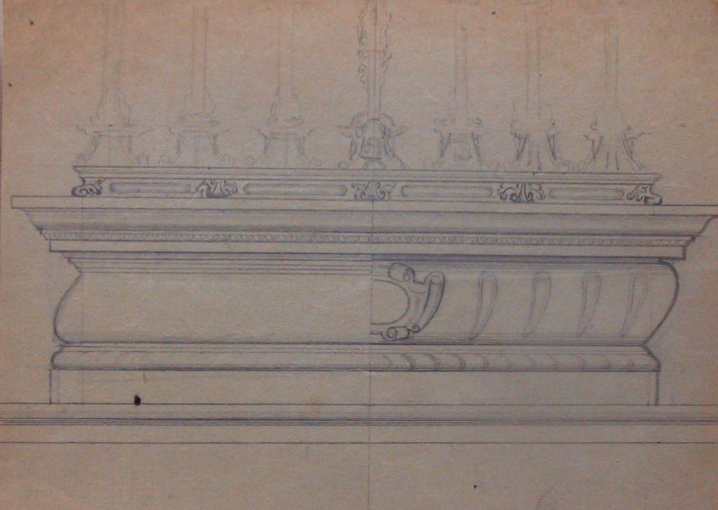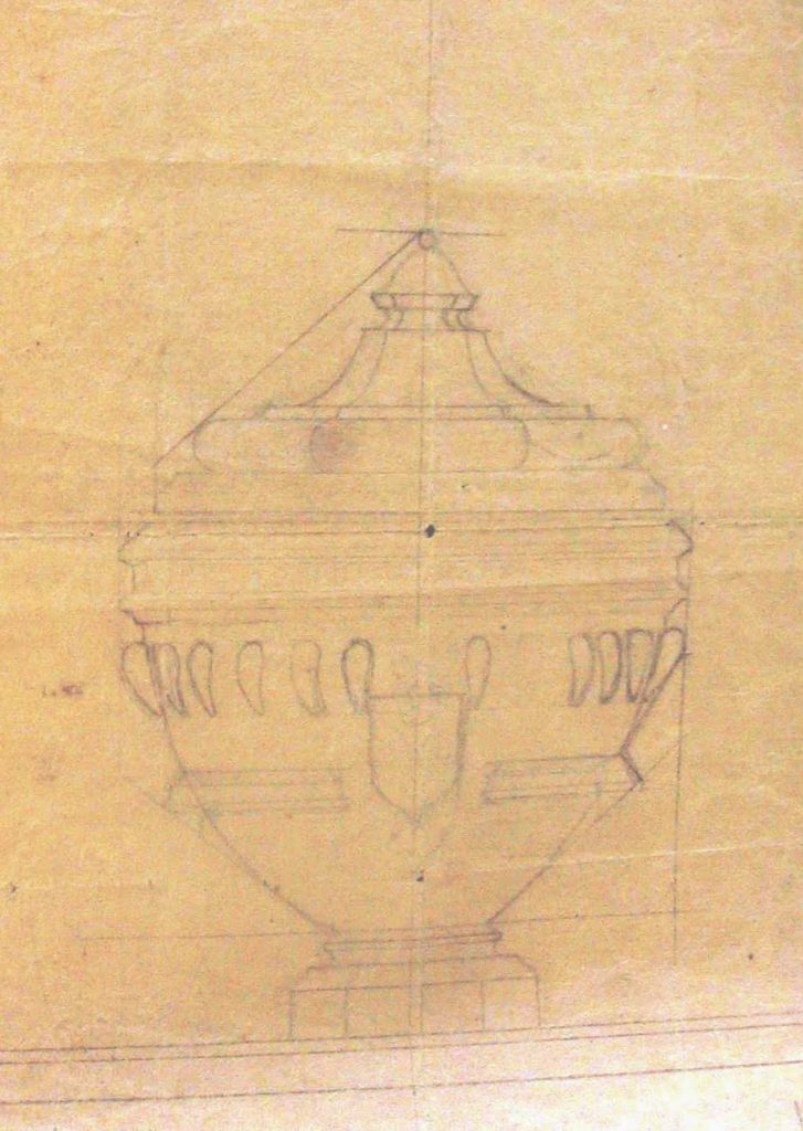 Obra : Boceto de pulpito con umbrela y remate de un Angel tocando la trompeta.