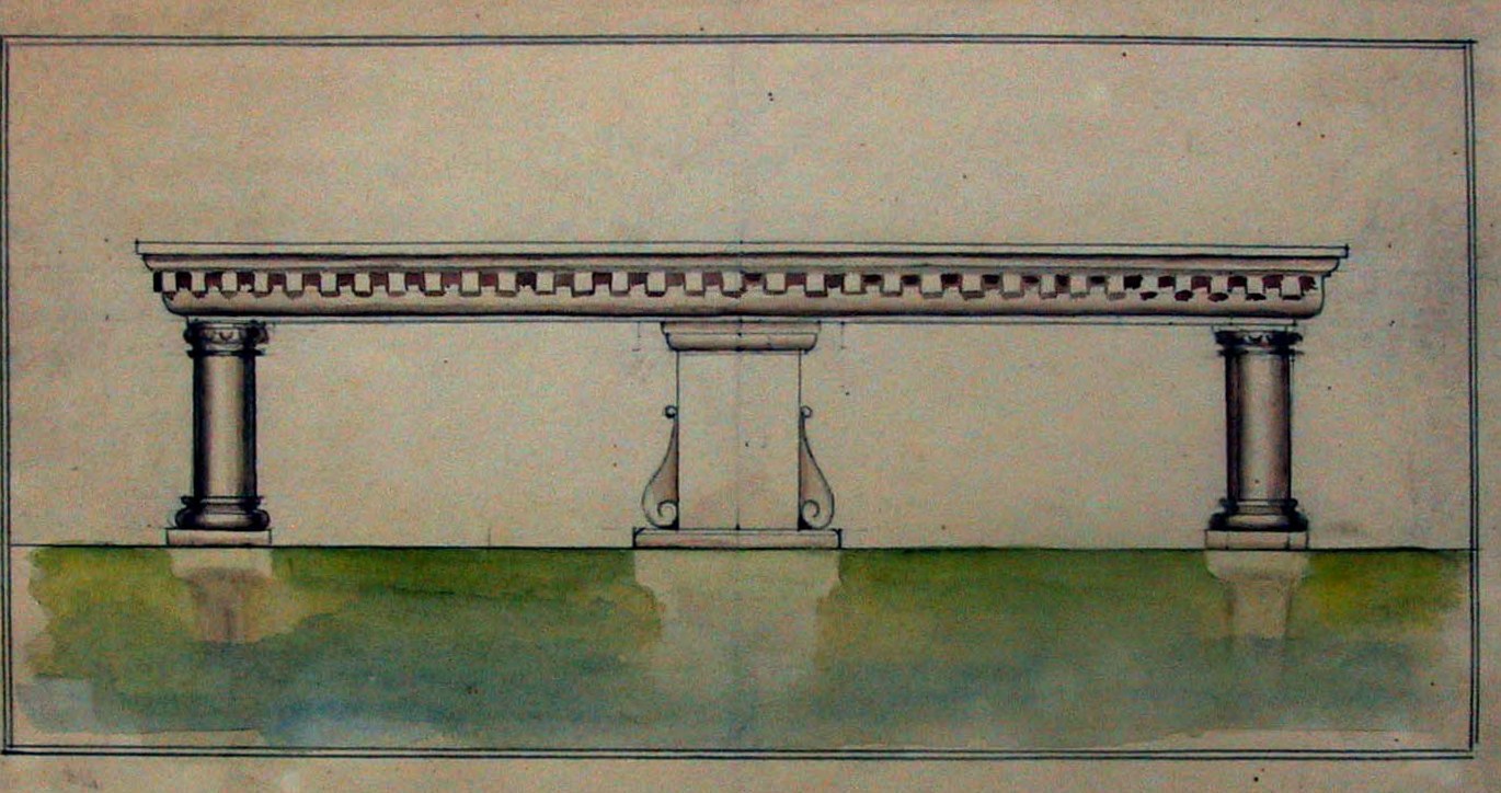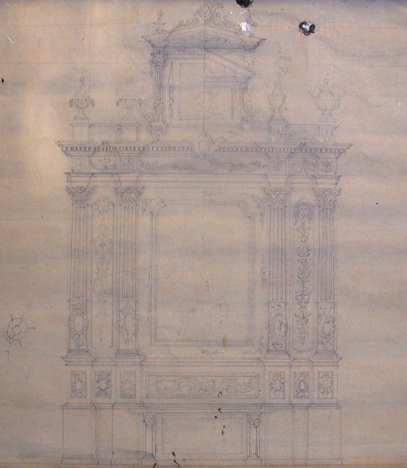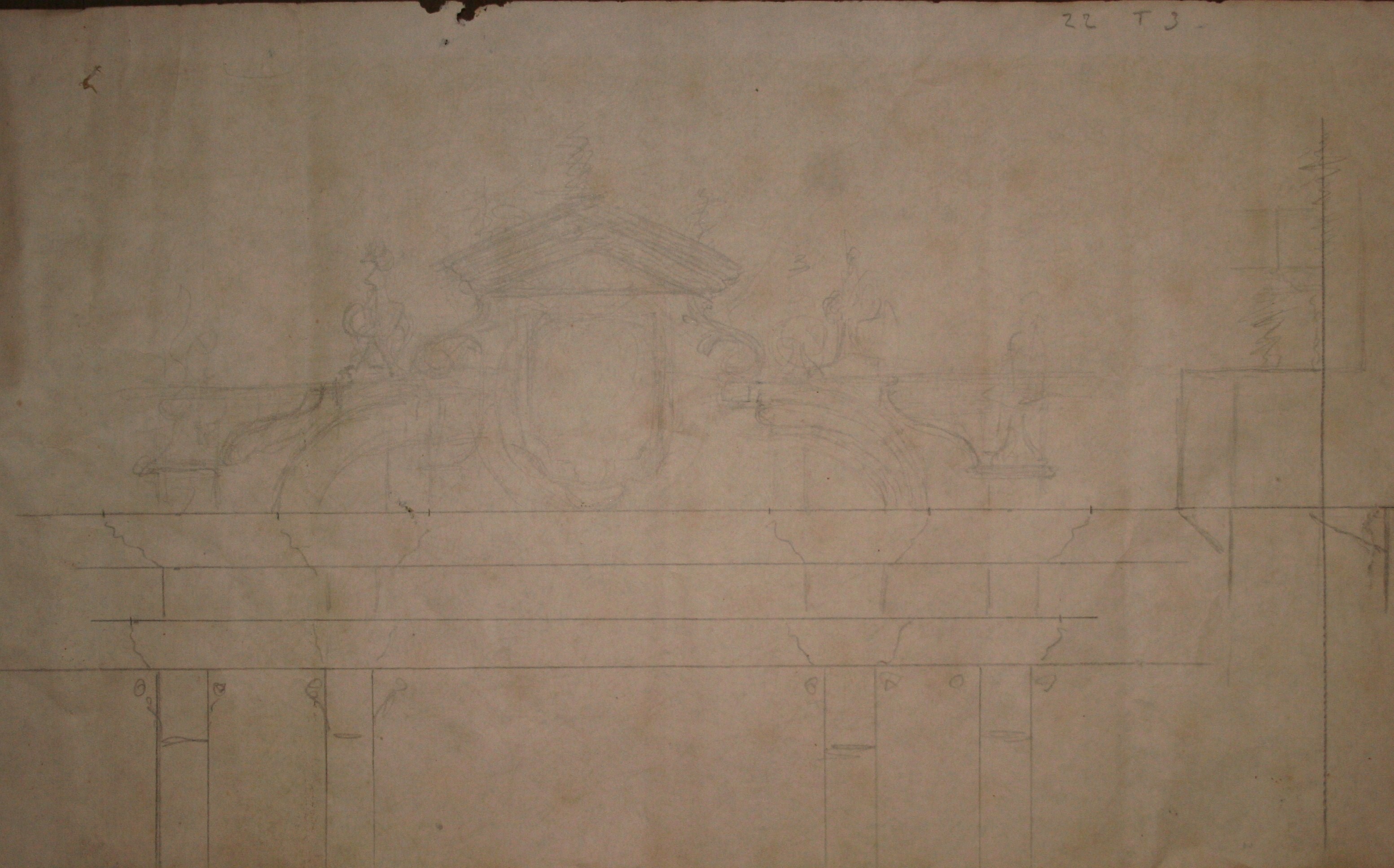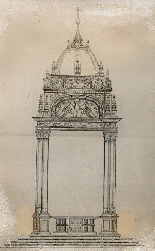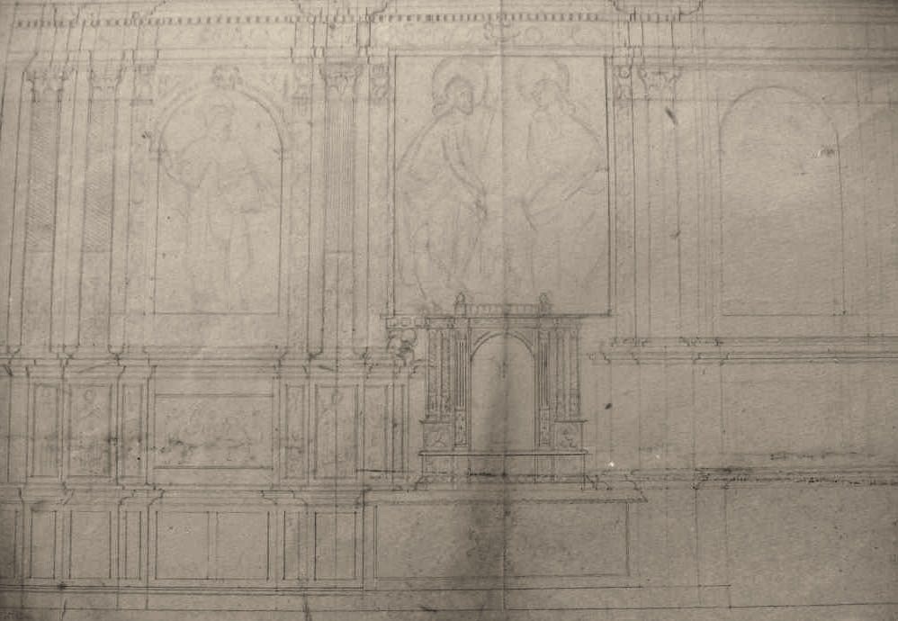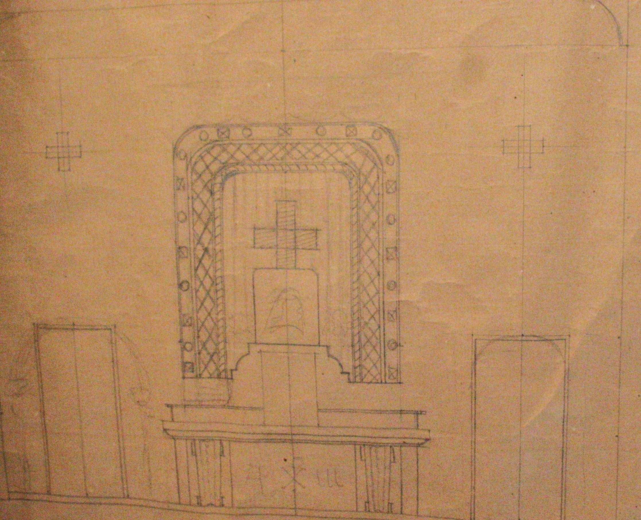Obra : Boceto de pulpito con umbrela y remate de un Angel tocando la trompeta.