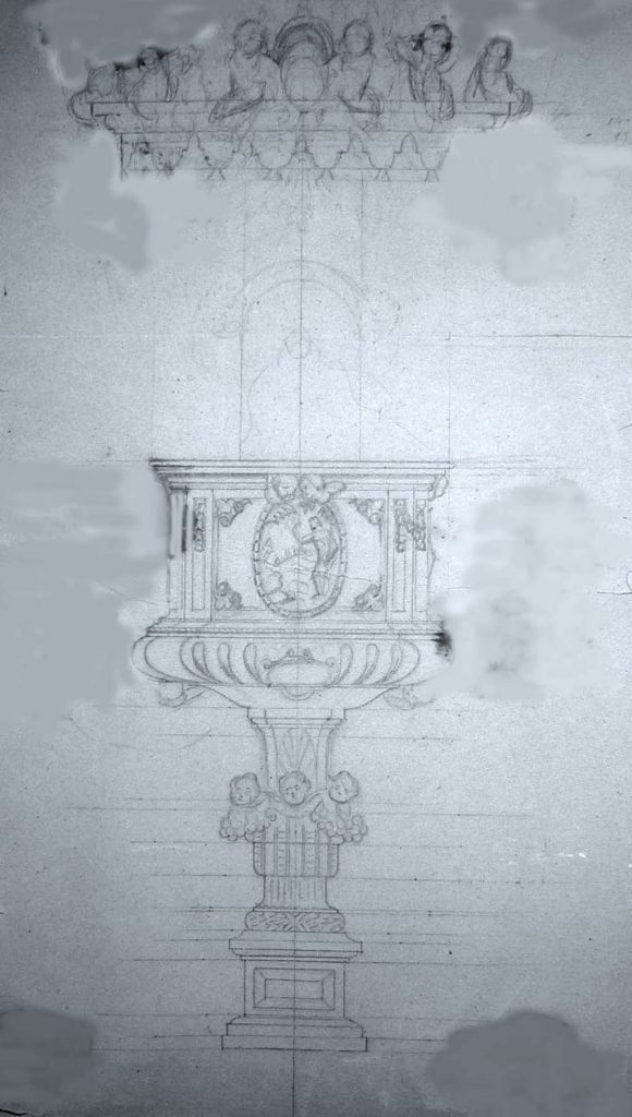 Obra : Boceto de pulpito con umbrela pulpito barroco con querubines en el pié, con medallones en su cuerpo y Angeles en la umbrela es el boceto que se ralizo para la iglesia de santos juanes.