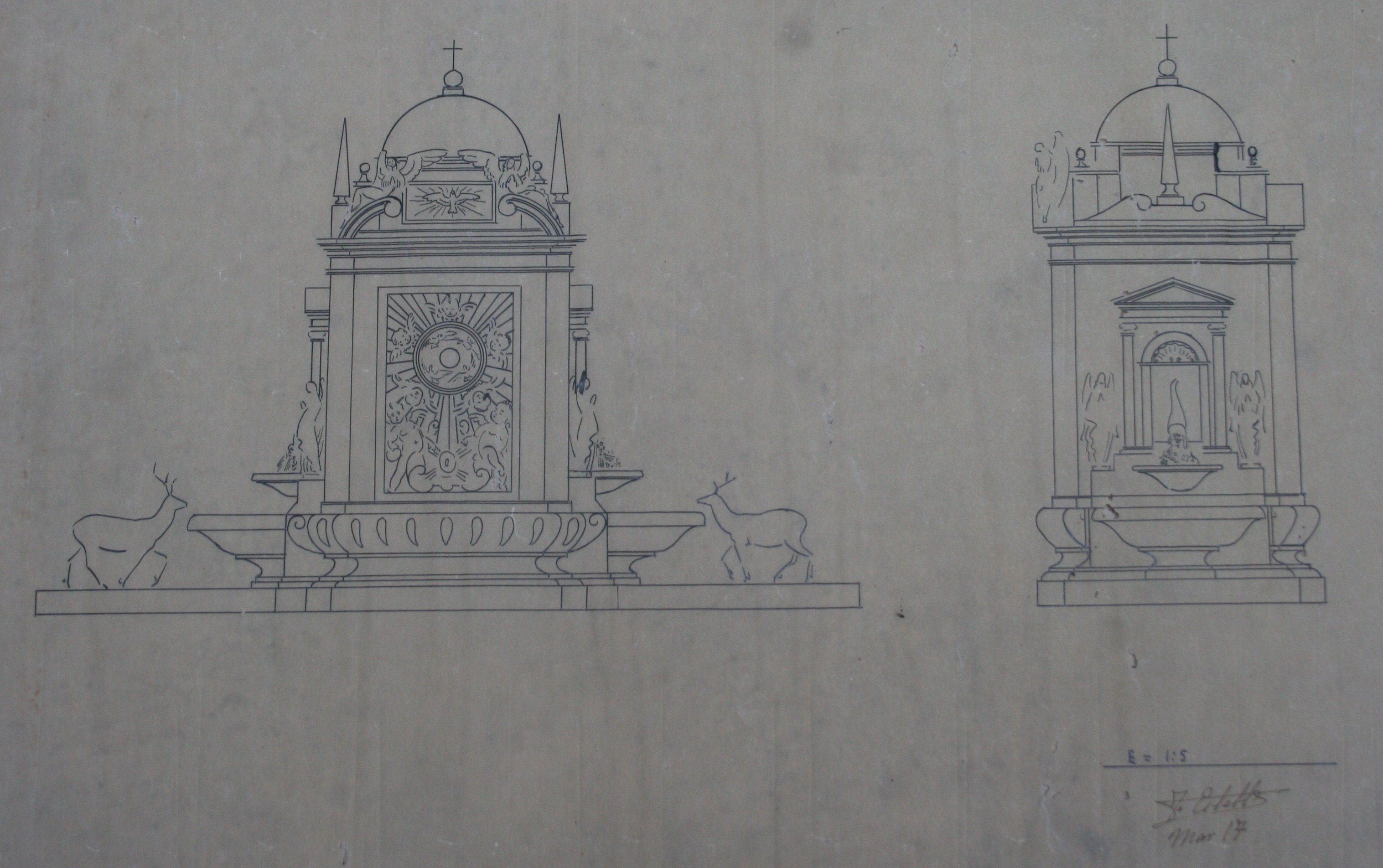 Obra : sagrario compuesto por un cuerpo central cerrado de medio punto, dos fuentes exentas en los laterales a las que acuden a beber sendos cervatillos, fuentes sobre las que se enmarca una breve hornacina plateresca flanqueada por dos figuras horantes, una puerta de bronce repujado y un frontis una figura yacente sobre cada una de las cornisas.