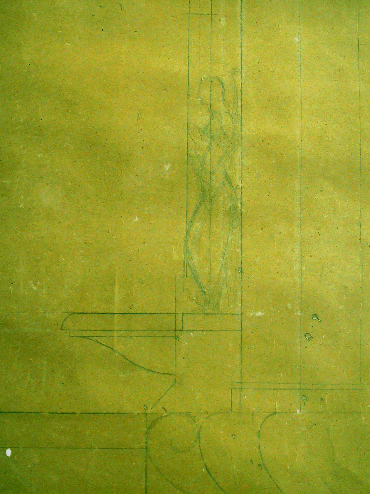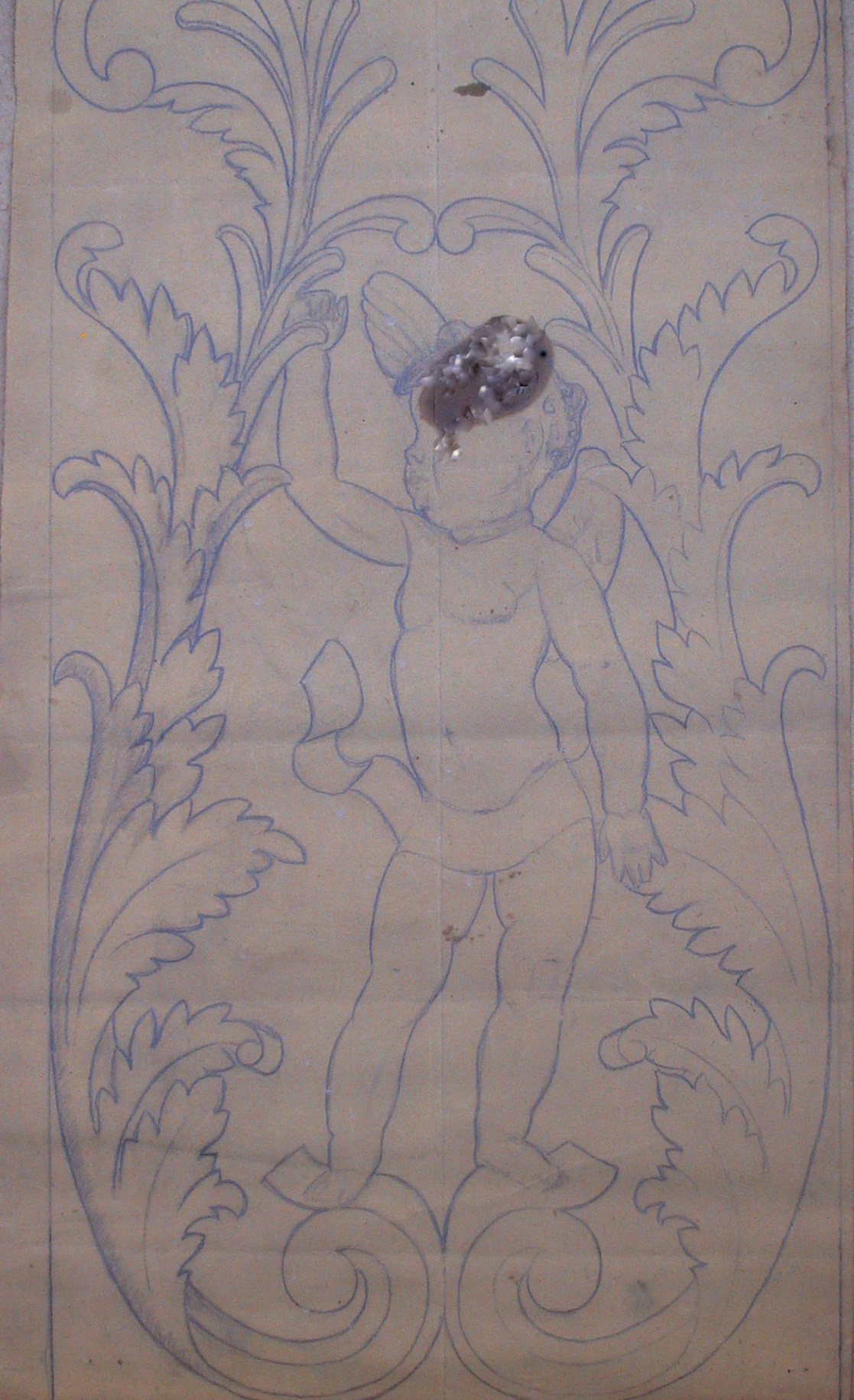 Obra : Dibujo a la cera de una imagen con quierubies en su base.