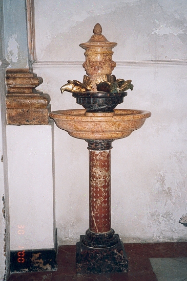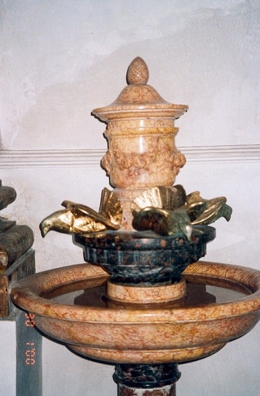 Obra : Pila de agua bendita con tres pajaros por donde mana el agua cuando los tocas.
